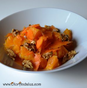 - Mientras hacemos una vinagreta con AOVE, miel y un poquito de vinagre de Pedro Jiménez y vertemos sobre la calabaza y la naranja.