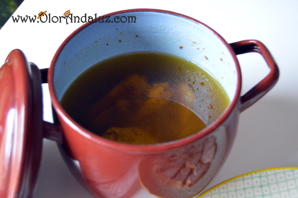 - Ahora colocamos el lomo en el recipiente que vayamos a utilizar (puede ser una orza de barro si tenemos o cualquier recipiente adecuado, en nuestro caso usamos una olla de nuestra abuela), y añadimos más AOVE hasta cubrir todo el lomo, pudiendo conservarlo en el frigorífico bastante tiempo, aunque se suele acabar antes 😉