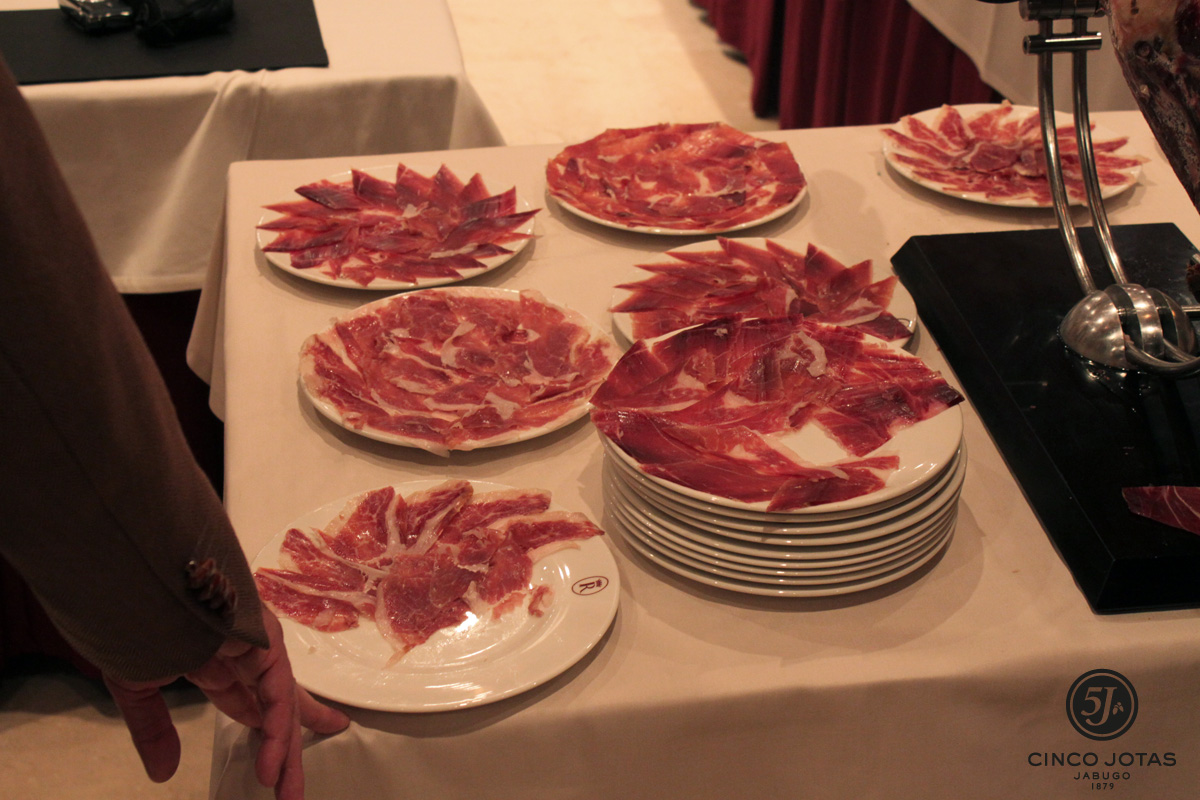 Par empezar, y para aquellos que aún no lo sepan, todos los jamones Cinco Jotas proceden de cerdos Ibéricos Puros criados en libertad, en las dehesas del suroeste peninsular, teniendo a su disposición entre 50 y 60 árboles por animal. Los cerdos, acompañados por su “personal trainer”, el porquero, buscan los frutos que les ofrece este paraje singular y al mismo tiempo recorren grandes distancias, lo que proporciona al Jamón unos aromas y sabores exquisitos. Después de 18 meses y de una posterior curación media en bodega de tres años, podemos degustar esta joya gourmet.
